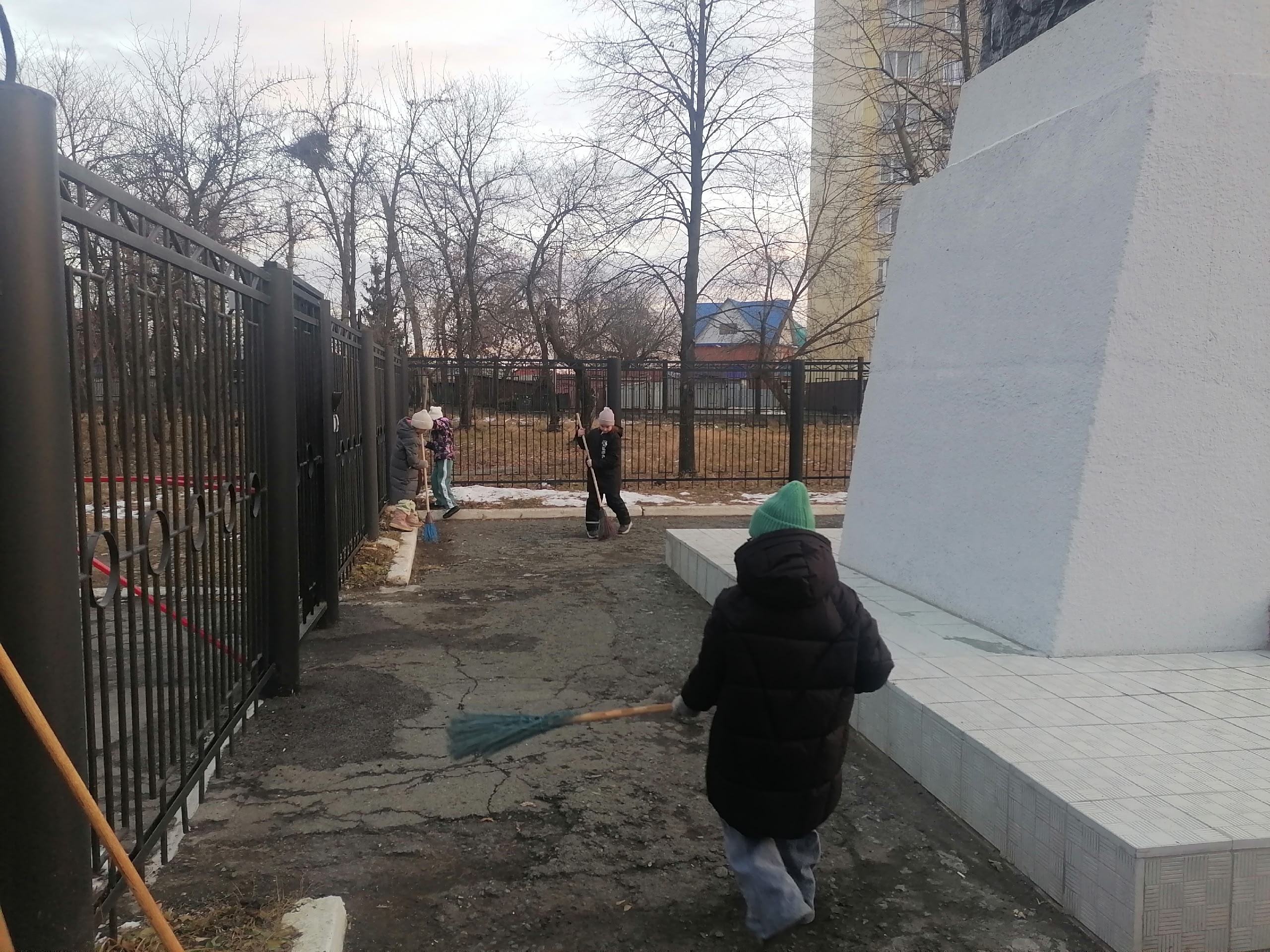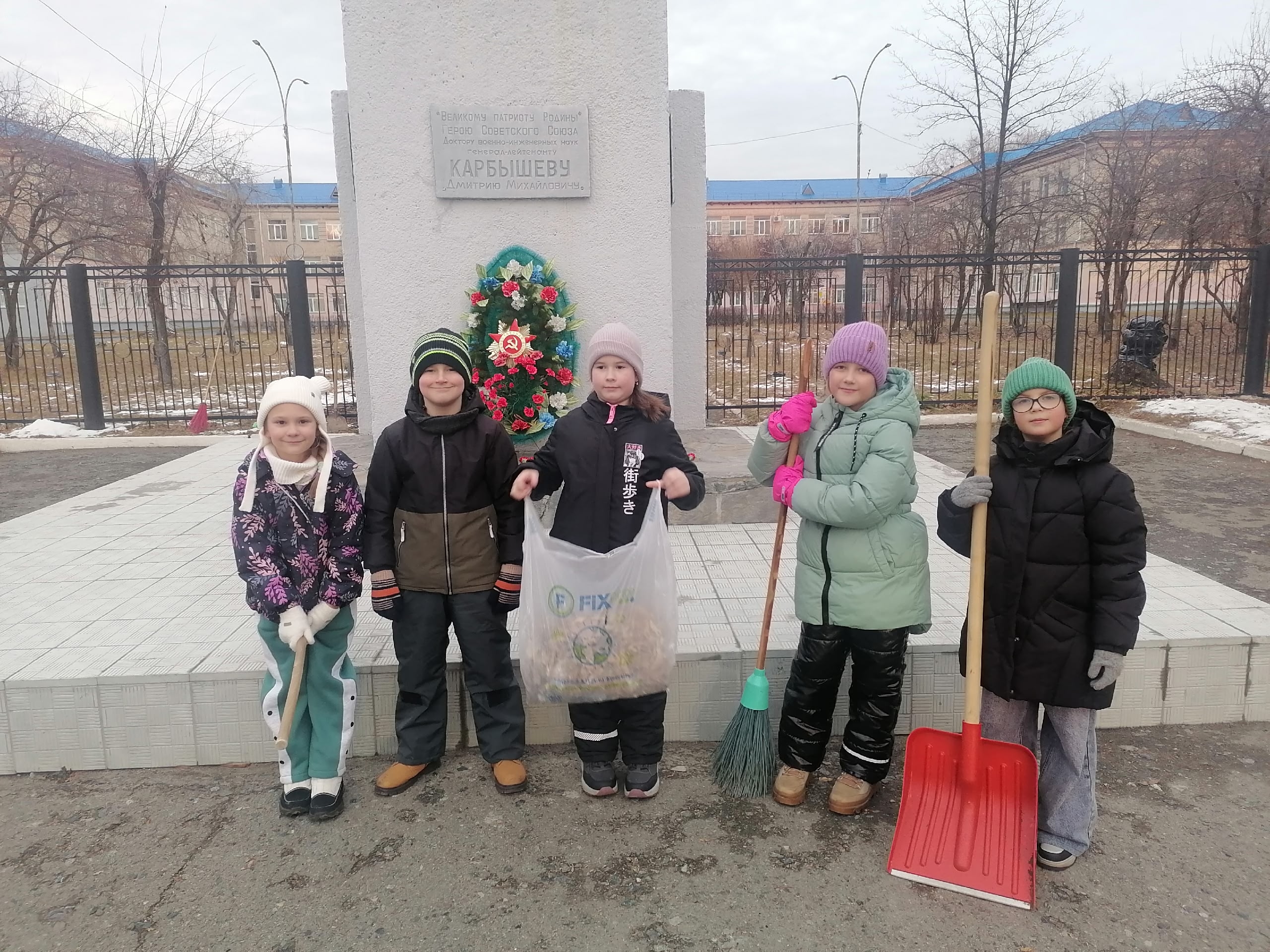 14 ноября, дети третьего класса вместе с воспитателем Натальей Александровной Черепановой вышли на школьную территорию, чтобы привести в порядок площадку возле памятника Дмитрию Михайловичу Карбышеву. Этот памятник — важная часть нашей истории и культуры, он напоминает нам о героическом прошлом. Ребята разделили инвентарь и быстро приступили к работе. Благодаря совместным усилиям, справились быстро и дружно.