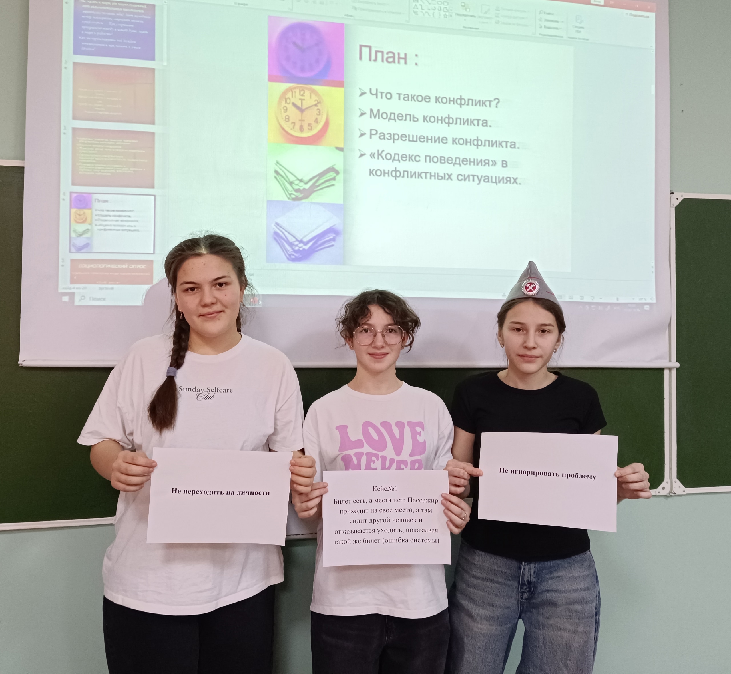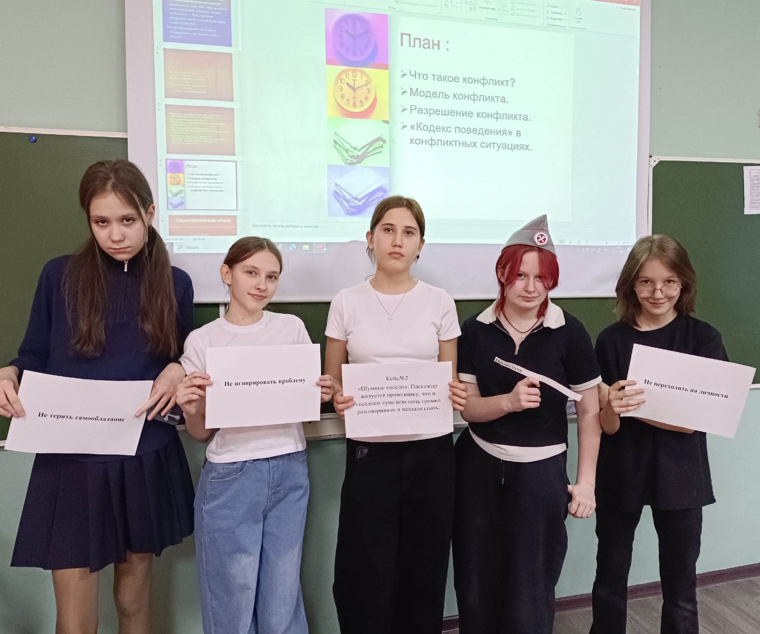 Познакомились с понятием «конфликт» — узнали, что это не просто спор, а столкновение интересов, которое можно и нужно грамотно решать. Но главное — практика! Класс разделился на группы, и каждая получила свой острый кейс: «Билет есть, а места нет», «Шумные соседи в купе», «Особый пассажир».
