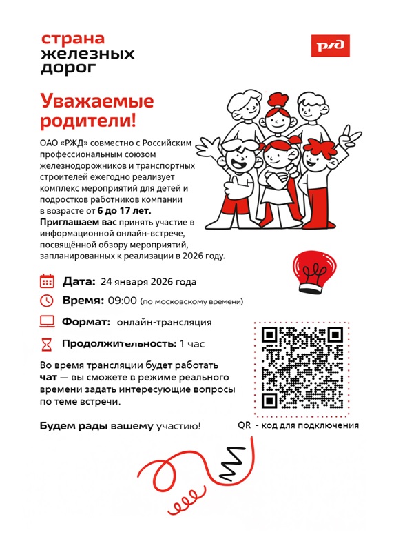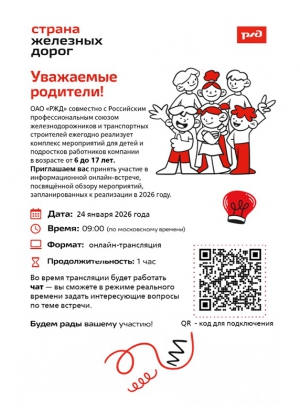 Уважаемые родители! Приглашаем Вас 24 января 2026 года в 09:00 (по московскому времени) принять участие в информационной онлайн-встрече, посвященной обзору мероприятий, запланированных к реализации в 2026 году. |