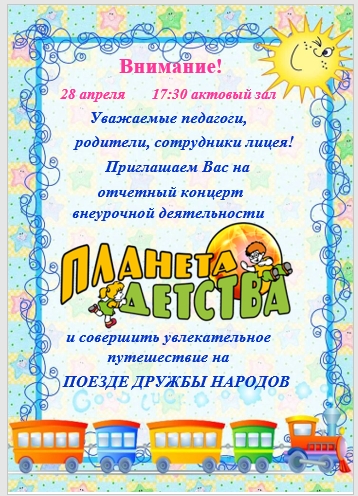 Уважаемые педагоги, родители и сотрудники! Приглашаем вас на отчетный концерт внеурочной деятельности "Планета детства", который состоится 28 апреля в 17.30 в актовом зале РЖД лицея № 5. |