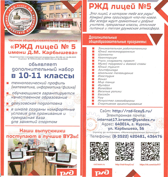 РЖД лицей № 5 объявляет дополнительный набор в 10-11 классы. Технологический профиль (математика, информатика/физика). |