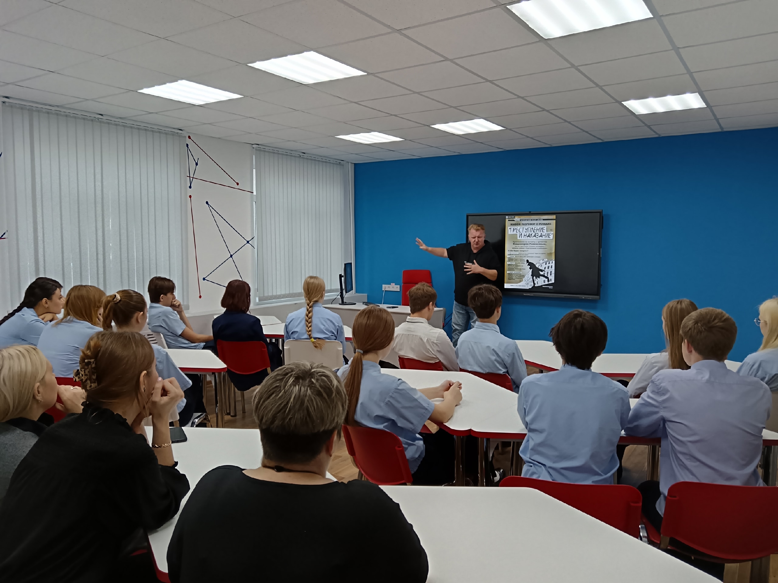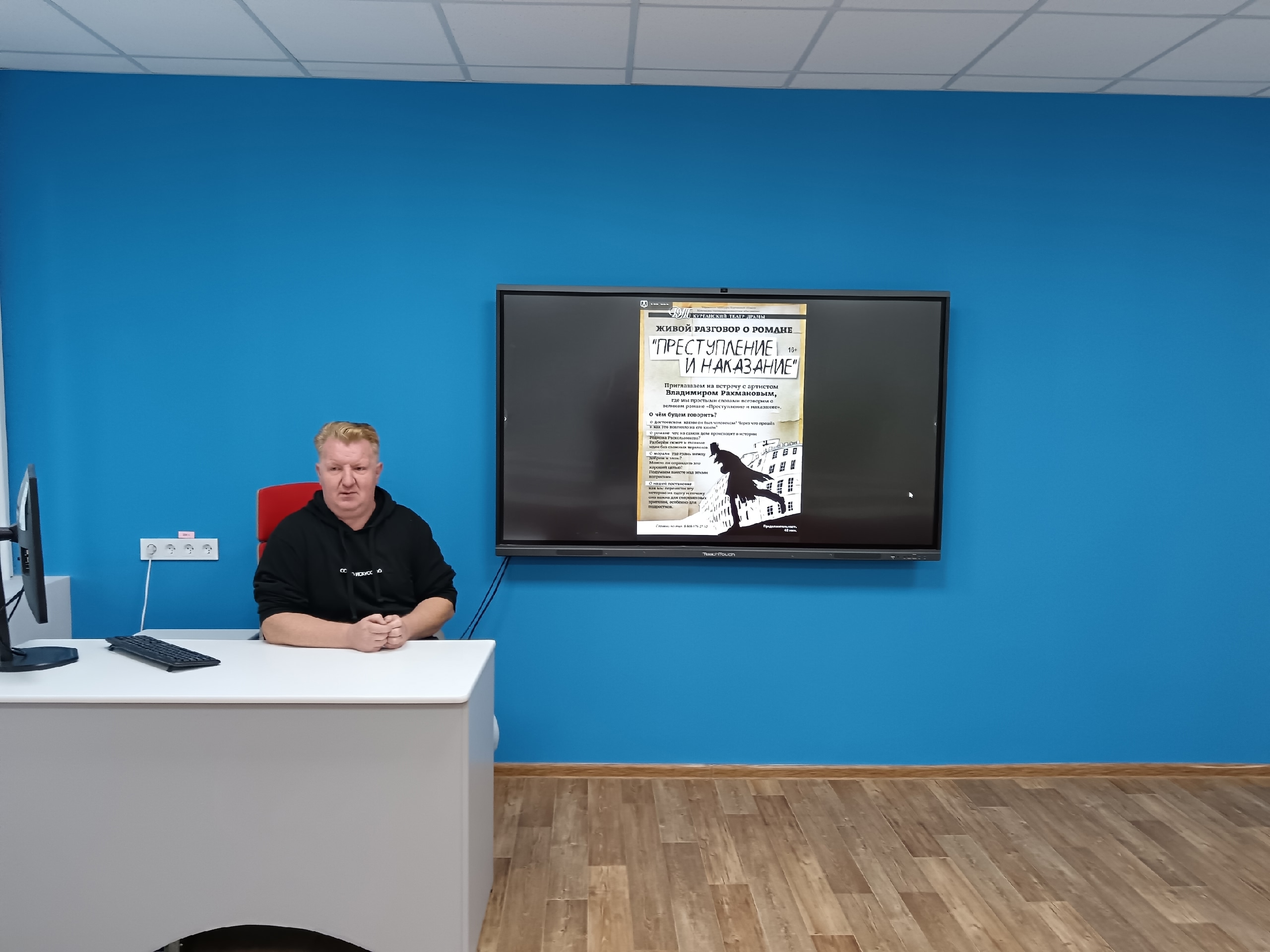 10 октября в нашем лицее состоялся увлекательный и познавательный диалог о классическом произведении Фёдора Михайловича Достоевского — романе "Преступление и наказание". Гостем мероприятия стал талантливый артист Драмтеатра Владимир Рахманов, который поделился своим взглядом на произведение и его актуальность в современном мире. Во время встречи Владимир Рахманов провёл живой разговор с учащимися, отвечая на вопросы о характерах героев, о нравственных дилеммах в книге и о роли анализа человеческой психологии в произведении. Особое внимание было уделено темам совести, наказания и искупления, которые остаются важными и волнующими читателей на протяжении многих лет.